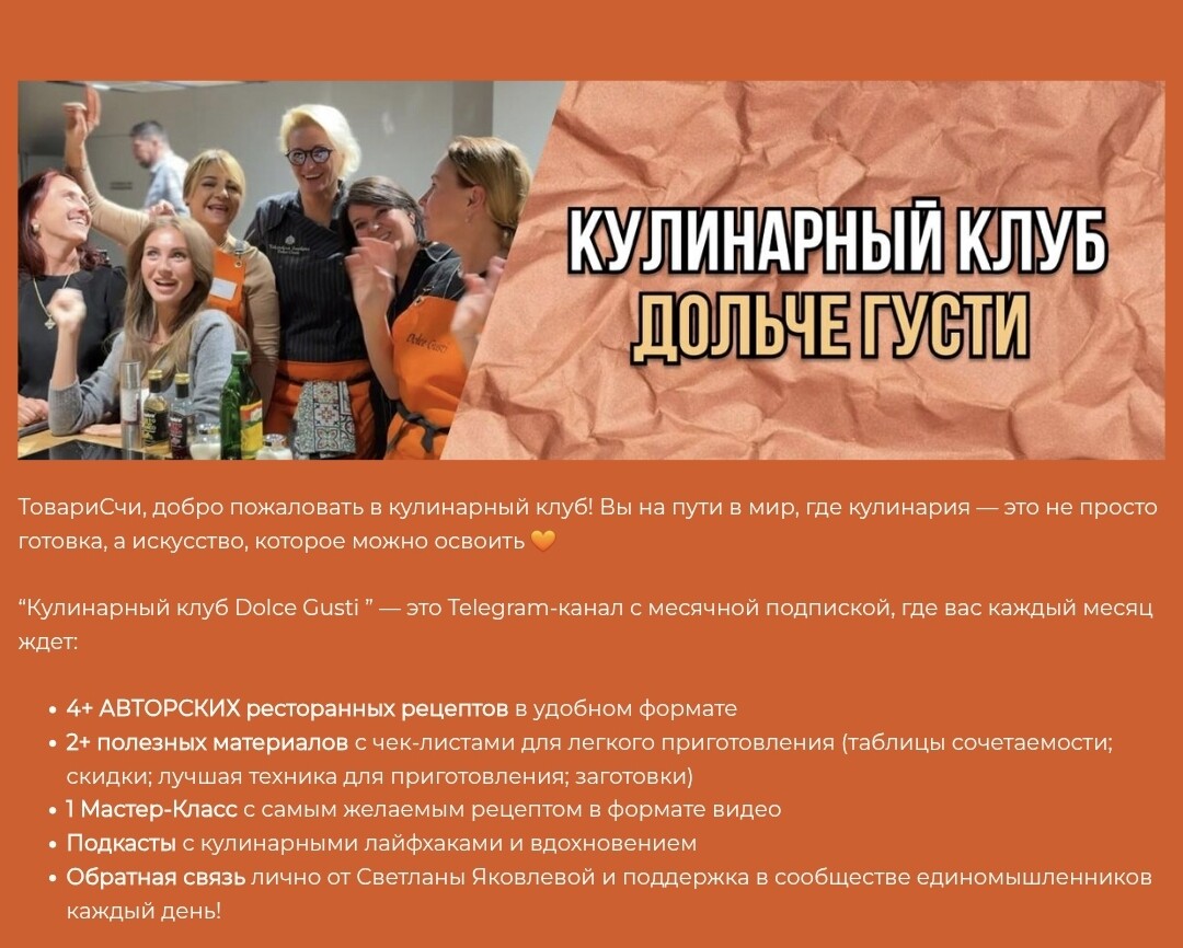 Кулинарный клуб Dolce Gusti ” — это Telegram-канал с месячной подпиской, где вас каждый месяц ждет: