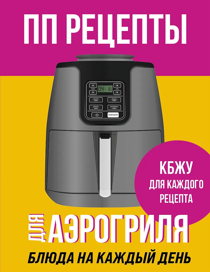 Кулинарная книга, в которой собраны ПП рецепты для аэрогриля. Блюда сгруппированы по категориям: завтраки, салаты и гарниры, супы и основные блюда, выпечка и десерты. В каждом рецепте прописано общее время приготовления, сложность, КБЖУ и количество порций. Рецепты ориентированы на людей, которые придерживаются принципов правильного питания.